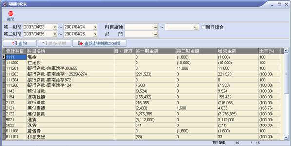1. 輸入二個比較期間,科目編號、部門編號並勾選是否顯示總合(於螢幕下方)後按【查詢】,做二個期間的比較表。