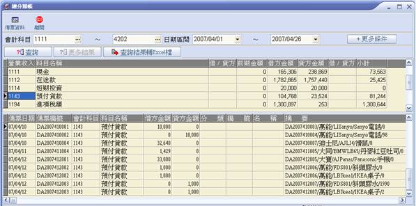 4級會計科目之總分類帳 1. 輸入科目編號、期間後按【查詢】,做該期間總分類帳查詢。