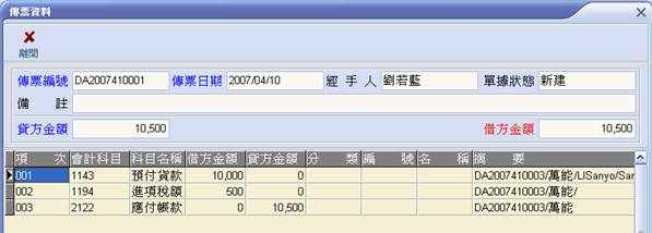 2. 傳票資料 (1) 選取所要查詢的傳票後,點選【傳票資料】。 (2) 出現此筆傳票內容,查閱完畢請選【離開】。