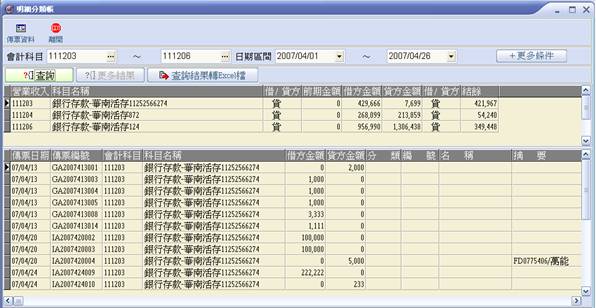 4級會計科目以下所有科目之明細分類帳 1. 輸入科目編號、期間後按【查詢】做該科目或期間明細分類帳查詢。