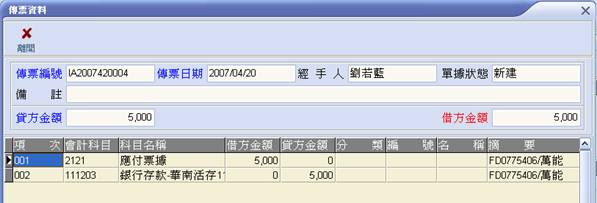 2. 傳票資料 (1) 選取所要查詢的傳票後點選【傳票資料】。 (2) 出現此筆傳票內容,查閱完畢請選【離開】。