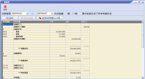 1. 輸入期間、科目級數(3級→會計科目編號3位數,4級→會計科目編號4位數),並勾選是否顯示該級科目下所有明細科目後,按【查詢】做損益表查詢。
