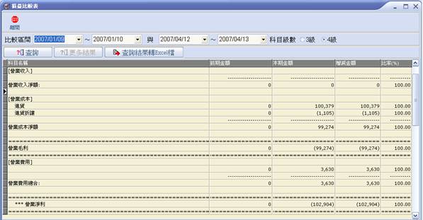 1. 輸入二個比較區間、科目級數(3級→會計科目編號3位數,4級→會計科目編號4位數)後按【查詢】做二個期損益表比較表查詢。