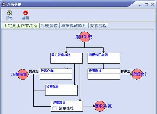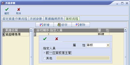 | 4. 簽核流程 (1) 點選【設定】。 (2) 選取單據後,點選【新增】。 (3) 選取屬性和指定人員後,請點選【Ⅴ】,完成第1順序指定人員設定。 |