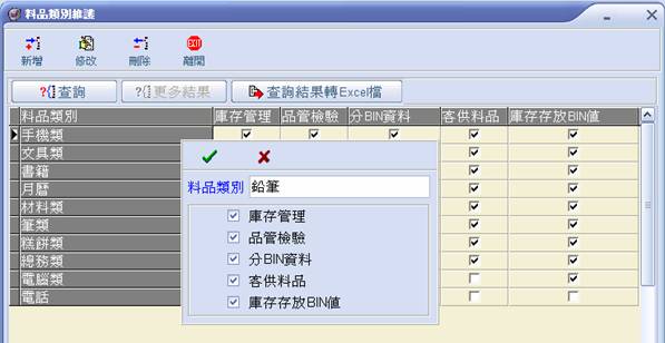 料品類別維護的選項有:庫存管理、品管檢驗、分BIN資料、客供料品、庫存存放BIN值,詳細說明如下: 庫存管理:該料品類別必需經由庫存系統來入庫、出庫。 品管檢驗:該料品類別必需要經過品管檢驗,此品管檢驗是以抽樣的方式來檢驗。 分BIN資料:料品可以選擇好、壞品的等級,好、壞品還可以分等級,例如:優等、良。 客供料品:料品在生產的時候,可以選擇該料品,且不列入成本計算。 庫存存放BIN值:存放於倉庫時選擇BIN值的等級,入、出庫時,不同等級,代表不同貨品。 新增:新增料品類別。 修改:無法修改料品類別名稱。 刪除:無法刪除尚有料品屬於該料品類別的料品類別。