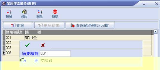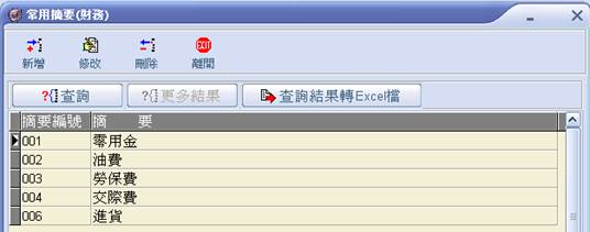 建立常用摘要後,於總帳會計系統中傳票維護可使用,方便做帳,不需一直手動key in,例如:零用金、油費這種常用的摘要,可在此先設定。 新增:新增常用摘要,摘要編號不可重覆。 修改:可修常用摘要。 刪除:可刪除常用摘要。
