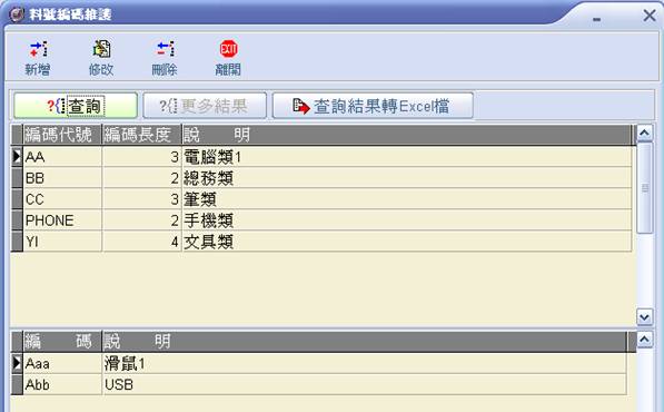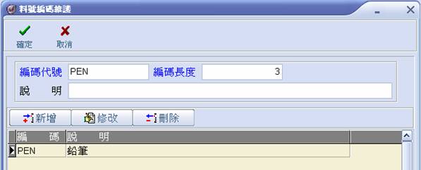 刪除:無法刪除尚有料品使用該編碼代碼的編碼代號。 |