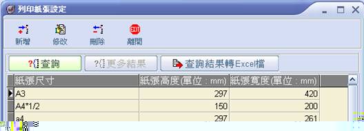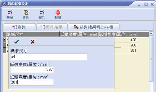 設立紙張的尺寸,在列印的時候,可供選擇,例如:傳票只需列印A4一半的大小,可設定紙張尺寸A4*1/2、紙張高度150、紙張寬度200。 新增:新增紙張尺寸,不可重覆。 修改:修改紙張高度及寬度,無法修改紙張尺寸。 刪除:刪除列印紙張設定。