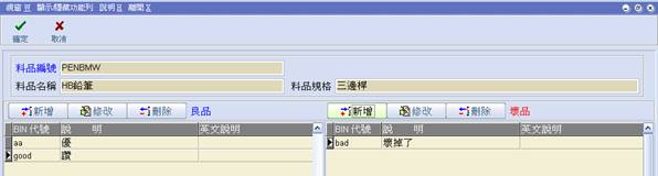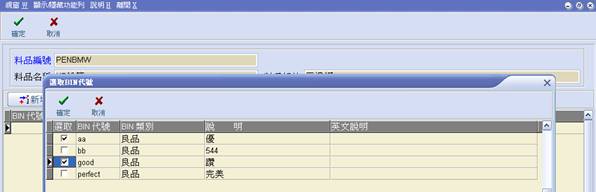 在此可設定各料品的BIN值。 新增:料品BIN值,一個料品,可設多種BIN值。 修改:可修改料品的BIN值。 刪除:無法刪除有使用過的料品BIN值。 複製:可選擇已設定BIN值的A料品,點選複製後,選擇B料品,系統會將A料品的BIN值複製到B料品