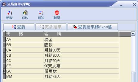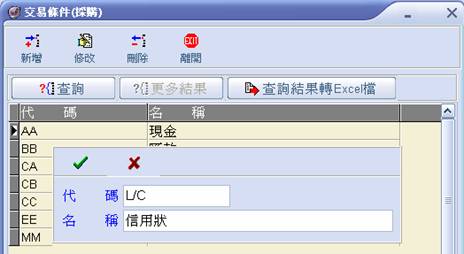 設定交易代碼,當在料品採購/銷售時,交易條件欄位可做選擇。 新增:新增交易條件代碼及名稱。 修改:可修正尚未使用的交易條件名稱,已使用過的不能做修改的動作。 刪除:可刪除尚未使用的交易條件,已使用過的不可刪除 停用/啟用:新增完成後,系統預設為啟用,若該交易條件暫停使用,可點選此按鈕將交易條件的狀態修正為停用。
