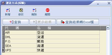 設定運送方式代碼,當在料品採購/銷售時,交易條件欄位可做選擇。 新增:新增運送方式代碼及名稱。 修改:可修正尚未使用的運送方式名稱,已使用過的不能做修改的動作。 刪除:可刪除尚未使用的運送方式,已使用過的不可刪除 停用/啟用:新增完成後,系統預設為啟用,若該運送方式暫停使用,可點選此按鈕將運送方式的狀態修正為停用。
