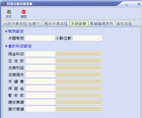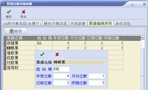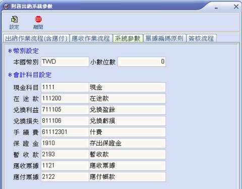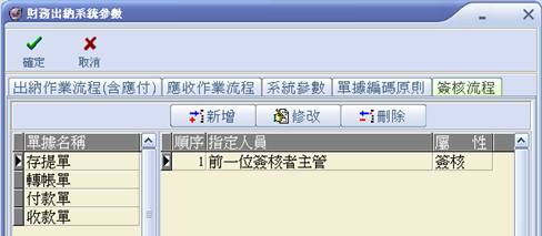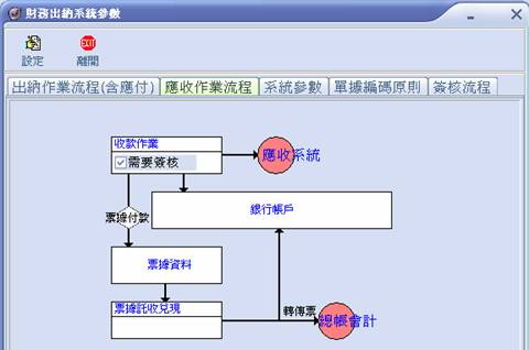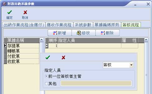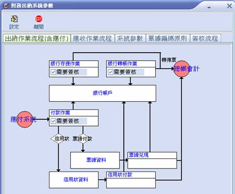 1. 出納作業流程(含應付)--按【設定】勾選銀行存提作業、銀行轉帳作業、付款作業是否需要簽核,確定後請點選【Ⅴ】。 ![]() | ||
