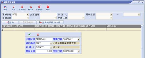 2. 兌現 (1) 按【兌現】,出現全部單據狀態新建之應付票據選單,勾選後輸入兌現日期,按【Ⅴ】。