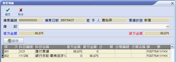 (4) 確認傳票內容無誤後按【Ⅴ】,出現傳票明細,若資料無誤,請按【Ⅴ】,付票據沖銷傳票轉入總帳會計/傳票維護。