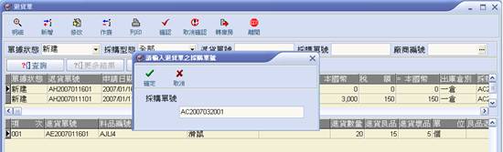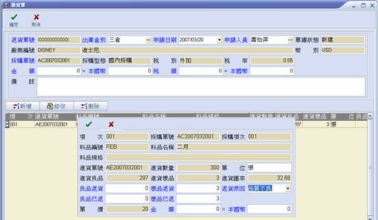 4. 點選【新增】,若採購單同時採購很多項目時,會出現選取進貨單的畫面,勾選欲退貨的單據,輸入良品退貨數量、退貨原因、金額後按【Ⅴ】。