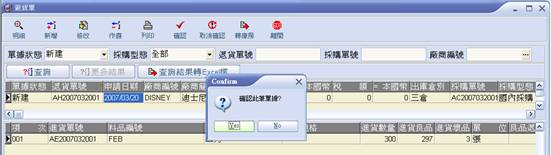 6. 至主畫面選取新建之退貨單號按【確認】,出現對話框,詢問是否確認此退貨單,請選擇【Yes】;單據狀態自動由【新建】改為【已核】。