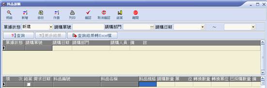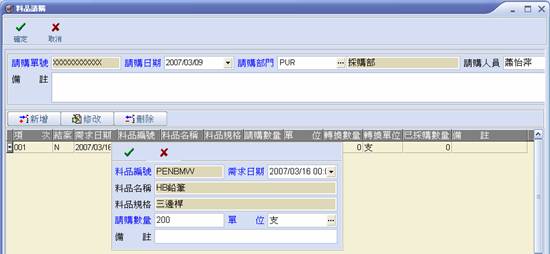 | 2. 輸入請購日期、請購部門等相關資料。 3. 點選【新增】選取請購之料品類別、料品編號,確定後請按【Ⅴ】。 4. 輸入需求日期、請購數量、單位、備註後按【Ⅴ】。 |