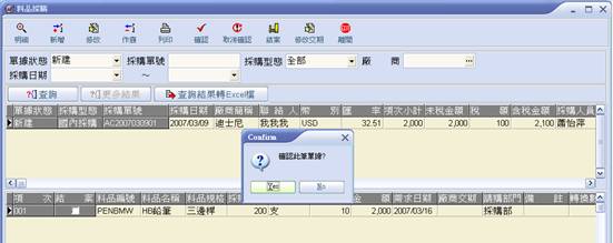 7. 至主畫面選取新建之採購單,請點選【確認】,即跳出對話框,詢問是否確認此採購單號,正確請點【Yes】。