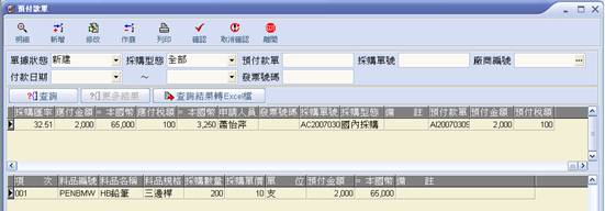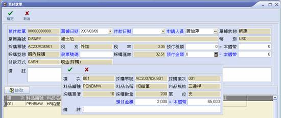 5. 預付款單資料正確輸入完畢後,請按【確定】。 6. 至主畫面選取新建之預付款單,點選【確認】,即跳出對話框,詢問是否確認此預付款單,請點【Yes】。