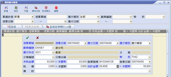 | 2.輸入期初應付帳款相關資料,確定後請選擇【Ⅴ】。 |