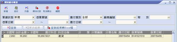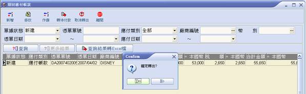 4. 至主畫面逐筆點選【轉待付款】,系統另跳視窗,詢問確定轉出,請點選【Yes】,【新建】自動改為【轉出】,資料自動轉入應付系統/付款申請。