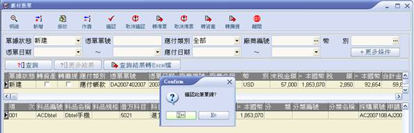 4. 至主畫面點選新建之應付憑單,按【確定】,即跳出對話框,詢問是否確認應付憑單,確認請按【Yes】。 |