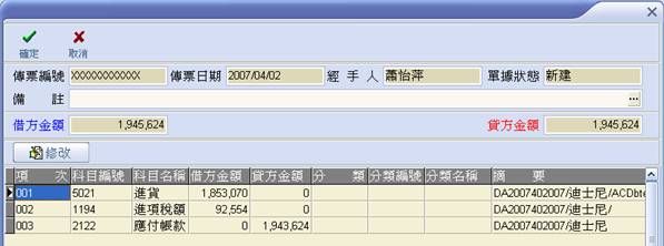| 3. 輸入表頭相關資料(金額除外)後,按【修改】確認借方科目、未稅金額等按【Ⅴ】,金額將自動帶入表頭資料內,確定無誤後按【確定】。 |