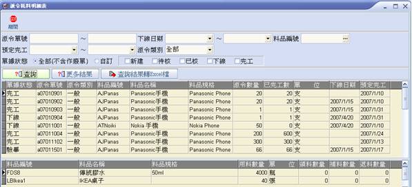 1. 輸入派令單號、下線日期、料品編號、預定完工、派令類別、單據狀態。
