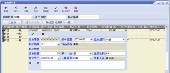請先確定該生產派令單之料品,於基本主檔BOM生產(用料清單)已建置完畢。