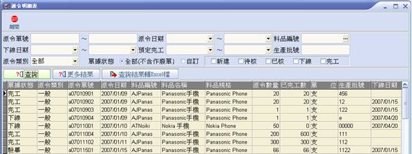 1. 輸入派令單號、派令日期、料品編號、下線日期、預定完工、生產批號、派令類別、單據狀態。