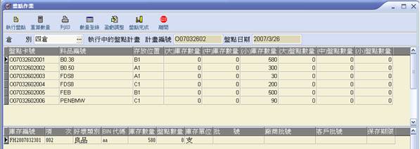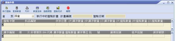 流程:執行盤點→(庫存)數量重算→列印盤點卡或盤點清冊→盤點(數量)登錄→列印盤點差異表→盈虧調整→盤點完成