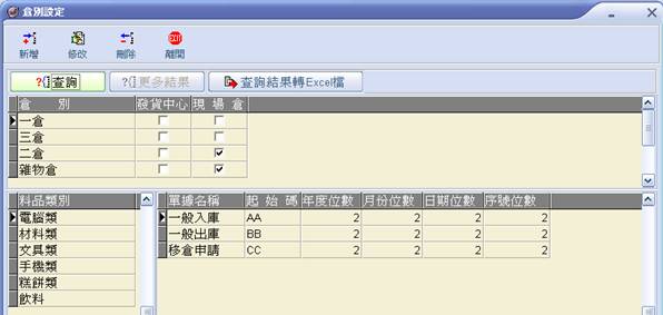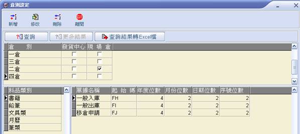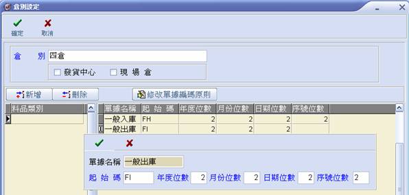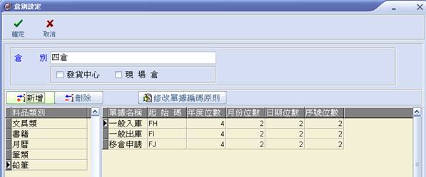 設定各倉別、各倉別可存放料品類別及各倉別一般入出庫、移倉申請的單據編碼原則。