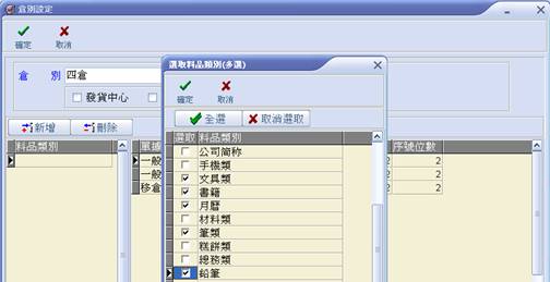4. 點選【新增】選取可存放至本倉之料品類別,確認後,請選擇【確定】。