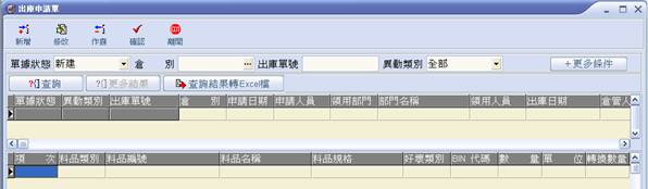 | 2. 輸入出庫倉別、異動類別、申請日期、申請人員、領用部門、領用人員後,點選【新增】。 |