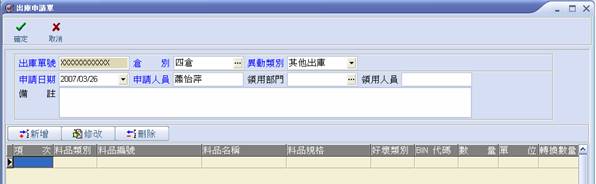 離開出庫申請單視窗 |