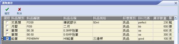 | 3. 出現該倉別目前庫存明細,請勾選(可一次勾選數筆)欲出庫之料品後,請點選【確定】。 |