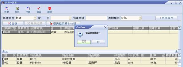| 6. 至主畫面點選【確認】,即跳出對話框,詢問是否確認此筆出庫申請單,正確請點【Yes】。 |