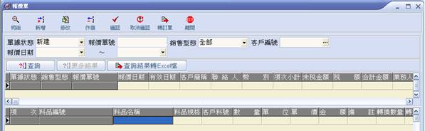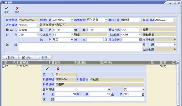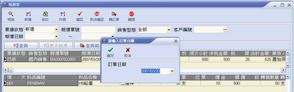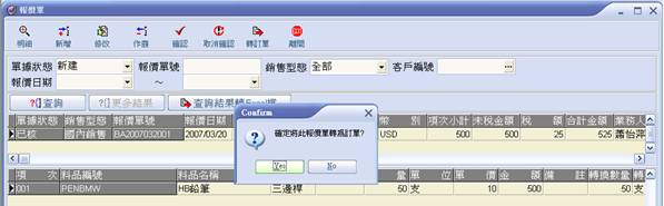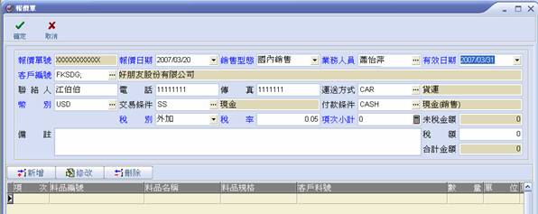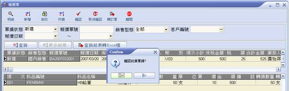 5. 再按【新增】,可輸入點選其它料品的報價內容。 6. 報價單內容誤後,請點選【確定】。 7. 至主畫面選取新建之報價單,確認無誤後請點選【確認】,跳出對話框詢問是否要確認此報價單,請點【Yes】。 |