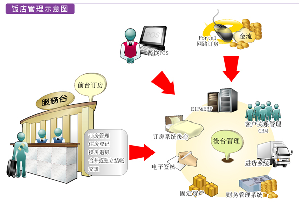 饭店管理、网络在线订房、餐饮POS、CRM(客户管理)、EIP、ERP整合性管理。