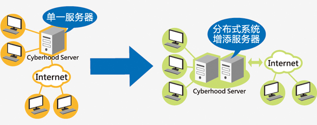 除了可以在原来的主机中增加硬盘、内存和CPU外,还可以直接增加主机,组合成多台主机共同运作的模式。就如银行的服务柜台一般,要服务的人多了,就增加更多的柜台来服务客户,在Cyberhood的分布式平台上随时可以依需要增加或移除不必要或不堪使用的主机。如下图所示: 一台主机(单一服务器)不够用了,或者是旧了怕当机,但又舍不得丢,在Cyberhood 的网络平台上,就可以直接把新的主机加进来一起服务(形成分布式系统),运行中就算有主机当机了,也不会中断系统的运作,