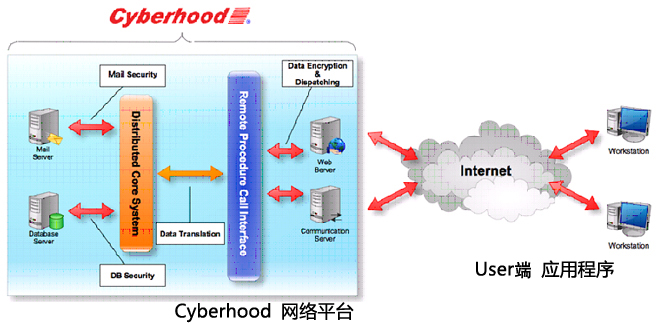 Cyberhood 分布式网络平台提供开放性架构(如下图),使得软件开发具备透通性能力,应用程序端不再受限于主机端的设备或系统的限制,可依使用性质采用不同的方式(例如、C++、C、Pascal、Java、…或浏览器的Ajax、Java Script、…等等)来完成应用程序的开发。由于Cyberhood的开发环境提供支持云端服务架构,搭配应用程序端的使用需求,在Cyberhood网络平台上撰写数据运算与存取服务程序,让信息系统很容易地成为云端系统。