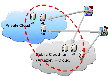 Cyberhood 的分布式网络平台可以同时建构在私有云(Private Cloud)和公有云(Public Cloud)上形成混合云(Hybrid Cloud )结构(如下图)。