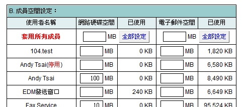 1. 進入網路硬碟頁面後點選「設定」,再點選「網路硬碟空間管理」,畫面出現空間使用量設定。 2. 於【A.公用區空間設定】,設定公用區的空間使用量。 3. 於【B.成員空間設定】,設定各人員的使用量,也可於【套用所有成員】統一設定使用量。