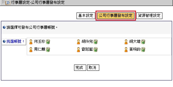 2. 點選「挑選帳號」,系統即出現【挑選對象小幫手】,待選擇好對象後點選「完成」,該人員即可使用此設定功能。