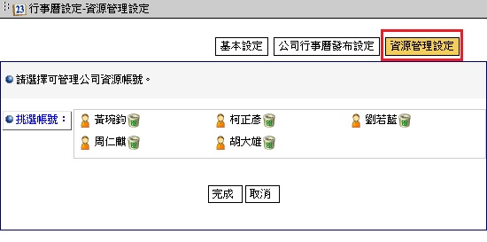 2. 點選「挑選帳號」,系統即出現【挑選對象小幫手】,待選擇好對象後點選「完成」,該人員即可使用此設定功能。