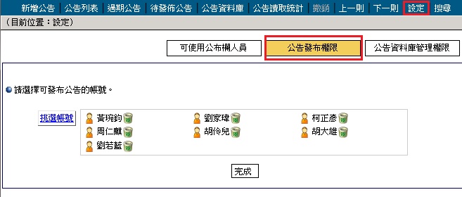 1. 點選「設定」再點選「公告發布權限」,系統另跳【挑選對象小幫手】,選出可使用人員。