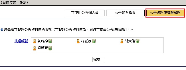 2. 點選設定再點選「公告資料庫權限」,系統另跳【挑選對象小幫手】,選出可使用人員。
