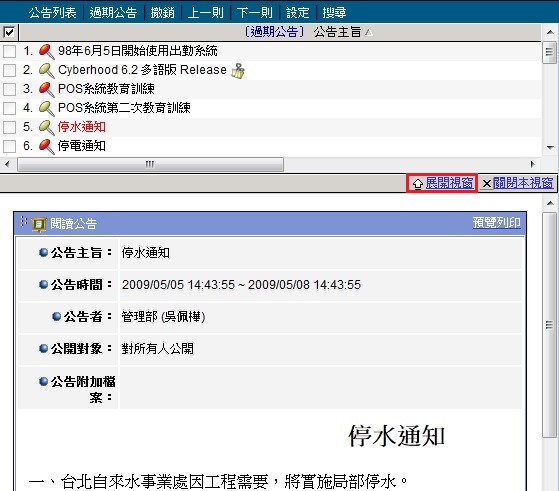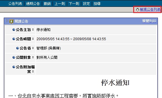 3. 點選公告內文右上方「檢視公告列表」,上方出現公告列表,內為視窗變小。