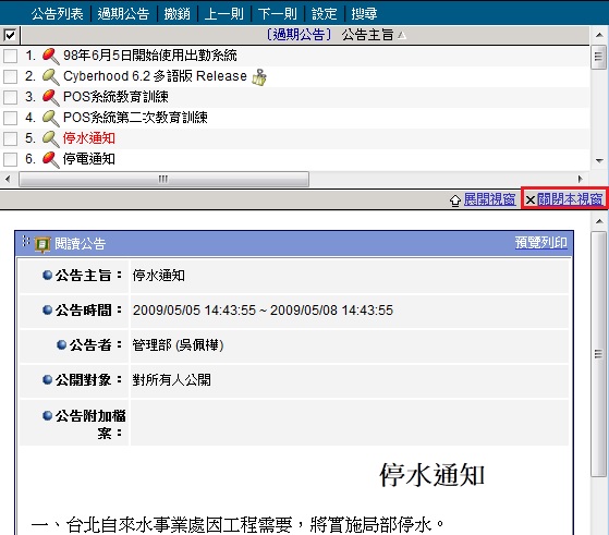 4. 點選公告內文右上方「關閉本視窗」,內文關閉只出現公告列表。