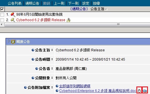 1. 公告中的附件檔案,可以直接點選瀏覽,也可下載到自己的電腦,更可以儲存到自己的網路硬碟中。 2. 點選附加檔案的檔案名稱,直接開啟檔案。 3. 點選檔案名稱右方的「下載」,檔案可下載至自己的電腦中。 4. 點選檔案名稱右方的「儲存到網路硬碟」,會另跳小視窗,選擇儲存位置後,該檔案就會儲存至網路硬碟中了。